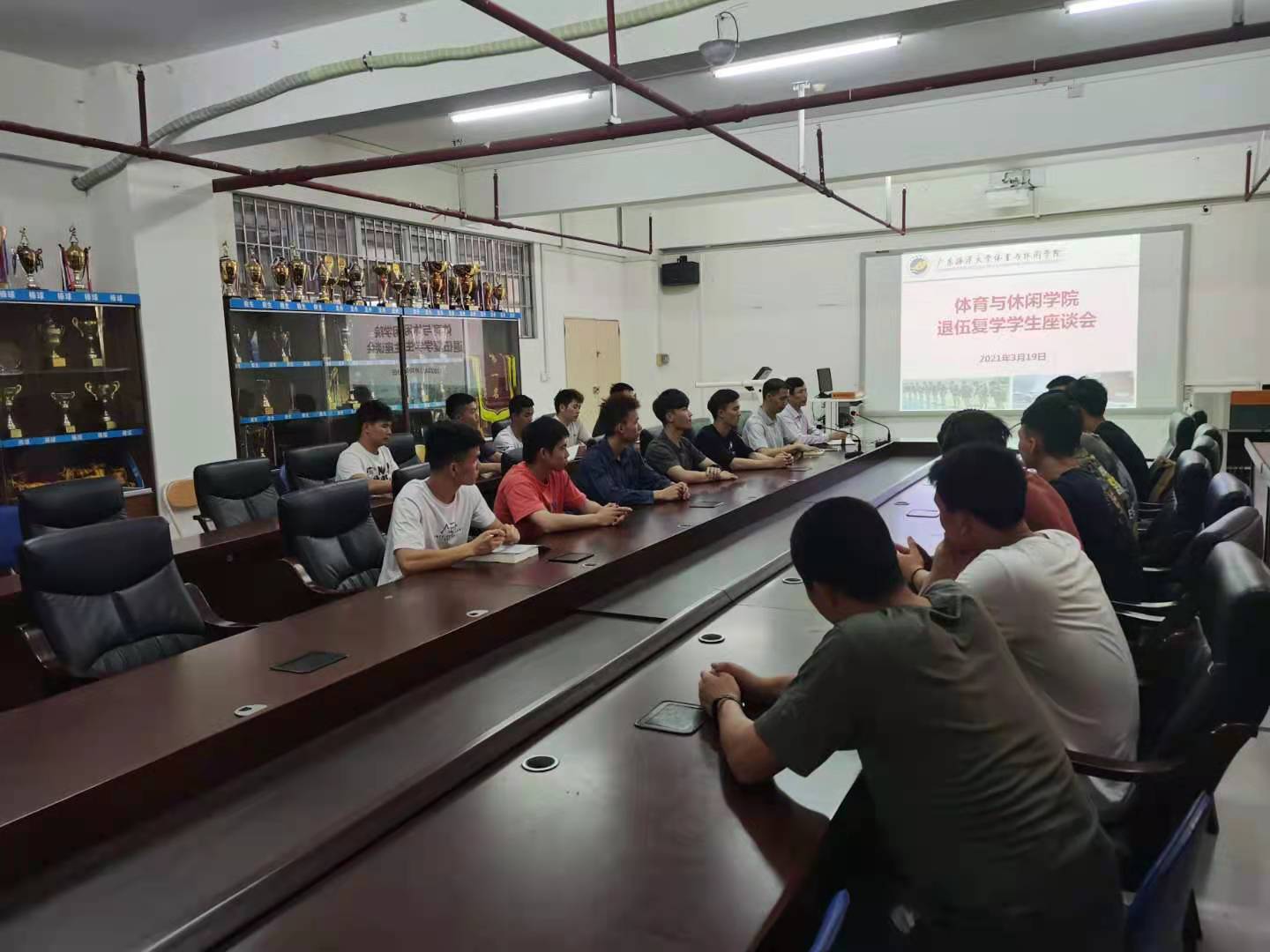 3月19日中午12时20分,学院李新华书记、蔡法副书记和马建辉、夏慈忠老师在体育馆会议室与体院18名退役复学的同学们召开了一场经验座谈会。
