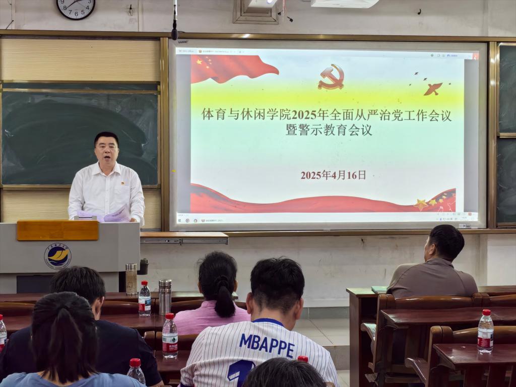 在广学楼208教室召开2025年全面从严治党工作会议暨警示教育会议,学习贯彻习近平总书记关于全面从严治党有关论述精神,学院领导班子成员和全体党员干部教师参会,会议由学院党委书记王明对主持。