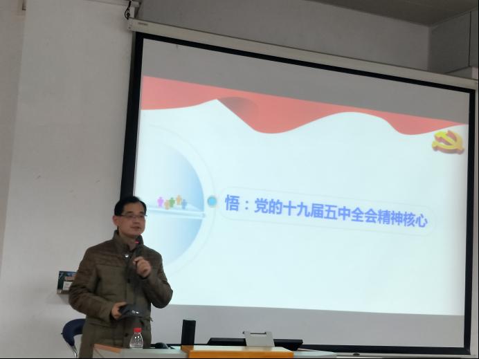 12月16日下午,化院和体院组织全体教职工在主楼330教室召开学习“四史”和党的十九届五中全会精神学习宣讲报告会。宣讲报告会由学校党委理论宣讲团杜军教授主讲,化院党委书记蔡鹰主持。