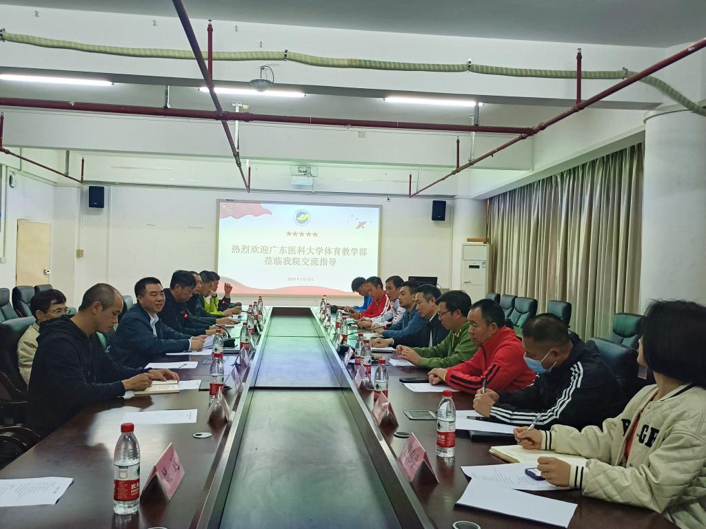 2024年3月13日,广东医科大学体育教学部陈凯书记和张枝尚主任一行10人到我院调研交流。学院书记王明对、院长周冰及各系部中心主任参加了座谈交流,双方就公共体育教学、体质健康测试、群体竞赛等方面开展了深入细致的座谈交流。