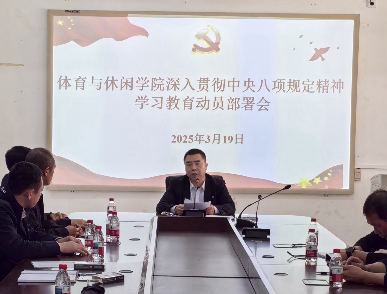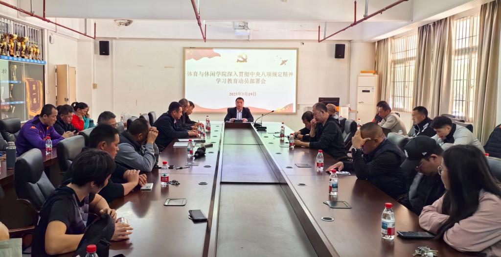 于3月19日在体育馆会议室召开深入贯彻中央八项规定精神学习教育动员部署会。学院党委书记王明对主持会议并作动员讲话,学院全体教职工参加会议。