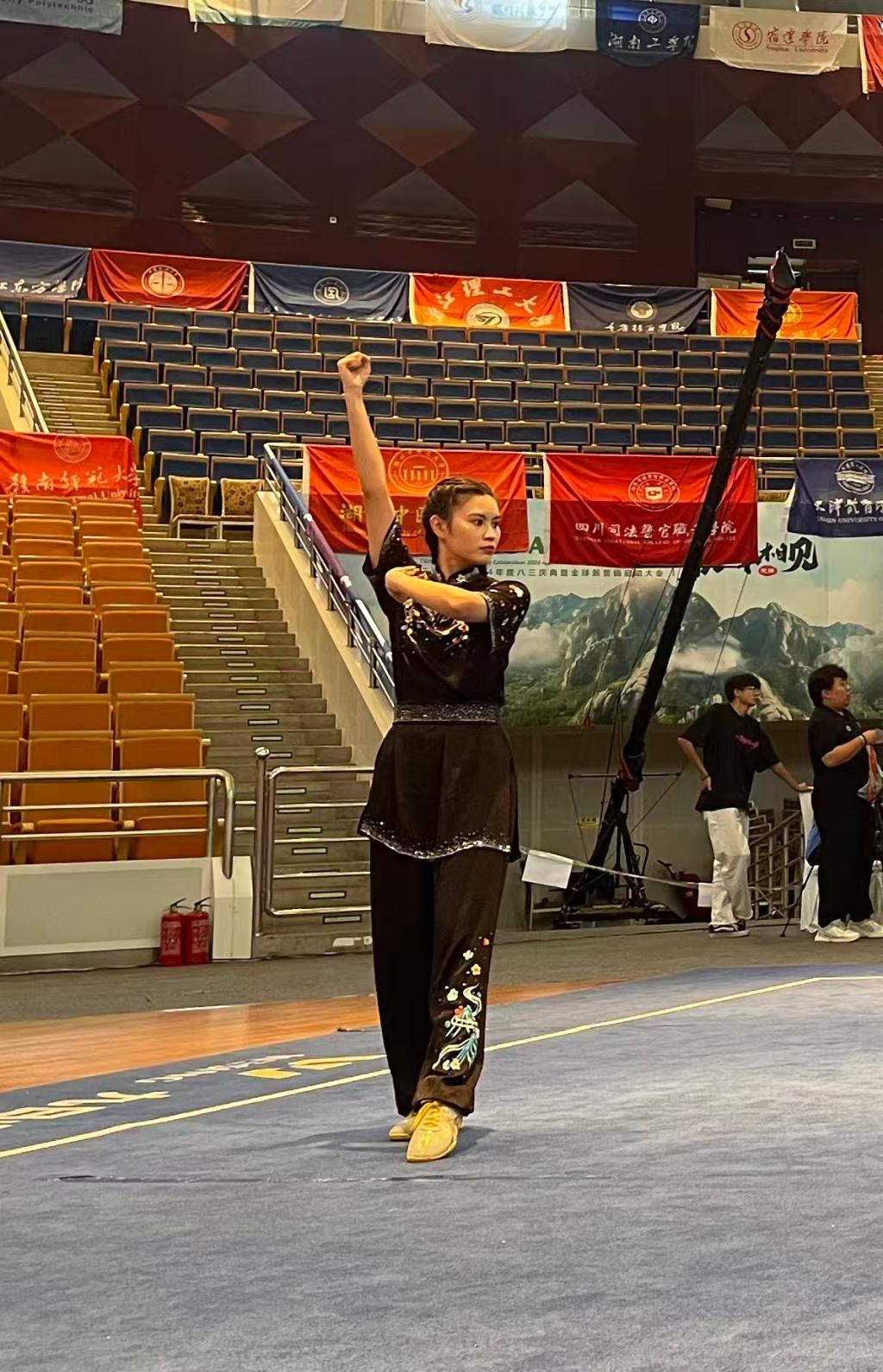 武术队陈静雅同学勇夺女子甲组单器械(扇)、枪术和 蔡李佛拳三枚金牌,以"一赛三金"的耀眼战绩,成为本届赛事最闪亮的新星。